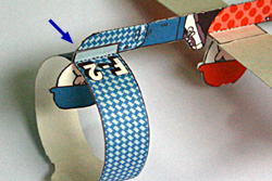 【9】 主翼・尾翼の調整をします。 胴体の下に小さな三角印がついていますので、そこを持って軽く飛ばしてください。
