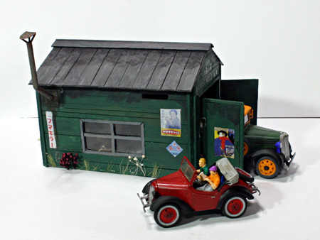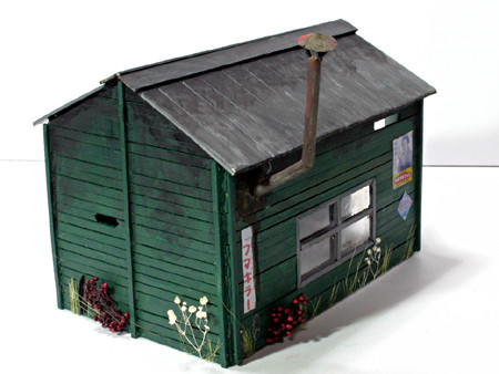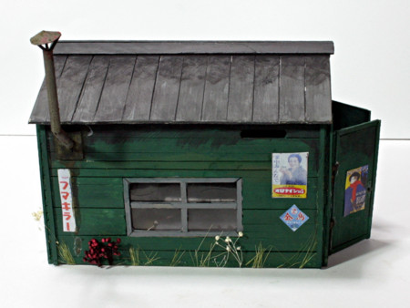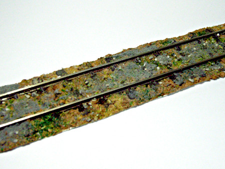 葉は光栄堂のランドスポンジ(荒目)。土台は紙粘土に砂と絵の具を混ぜ合わせました。草で見えなくなりましたがちゃんと地面なっています。ランドスポンジを枝に貼付けるのに木工用ボンドを使いましたが、スポンジがボンドを吸い込んでなかなか接着できないので、セメダインみたいな接着剤で貼付けました。
