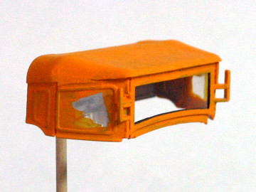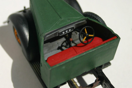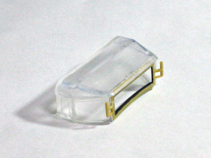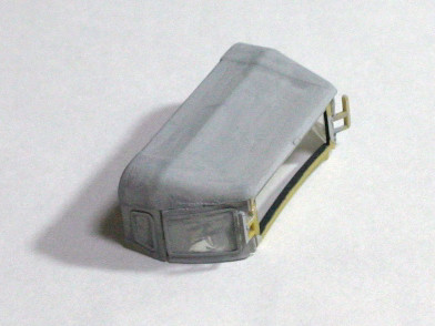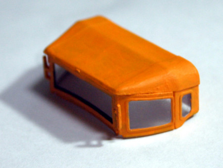 幌の塗装(0809) 幌とガラス部は画像のように透明プラスチックで一体になっていて、またこれの塗装が厄介です。リキテックスなら簡単にできますので試してみてください。プラモ用油性塗料ではできません。 まず、ガラス部を気にせず下地塗料を塗る。ガラスにはみ出てもかまいません。 下地が乾いたら塗装し、完全に乾いたら、ガラス部の塗料をつまようじの先で削っていきます。窓枠がついているのでやりやすいです。ここでも削りカスを吹き飛ばすのにサンワ エアーダスターが役に立ちます。