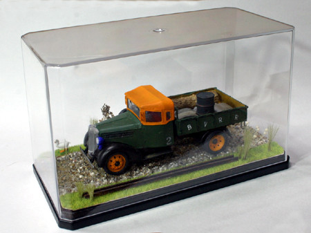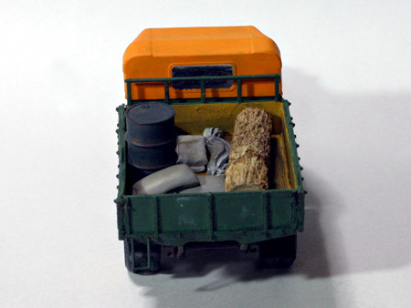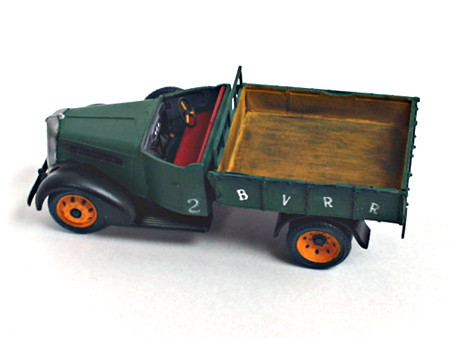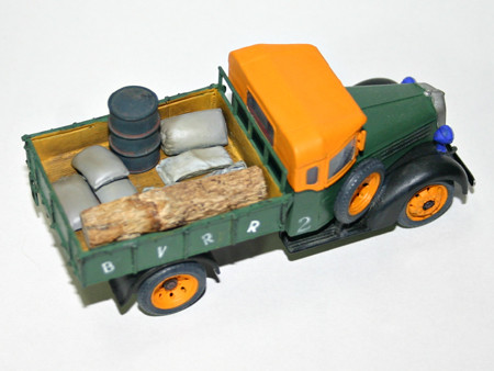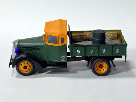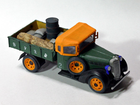 いすゞTX40型九七式自動貨車、完成(0809) ホイールベースのショートカットも無事すみました。岐阜のチンチン電車(名鉄岐阜市内線/廃線)も名鉄色(赤)になる前は、こんな色でした。 ブーピープバレイ鉄道の車輛制作前の肩ならしというところでしょうか。くろがね四起といすゞ TX40型 九七式自動貨車を作っているうちに、On30のブーピープバレイ鉄道の構想ができてきました。 荷台の「BVRR」のBとVの間をカットしてありますが、カット部分が目立たなくまあまあの出来だと自負しています。 荷台に積んである土嚢、ドラム缶はタミヤ製です。