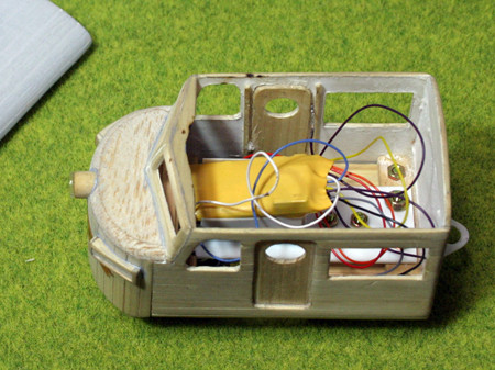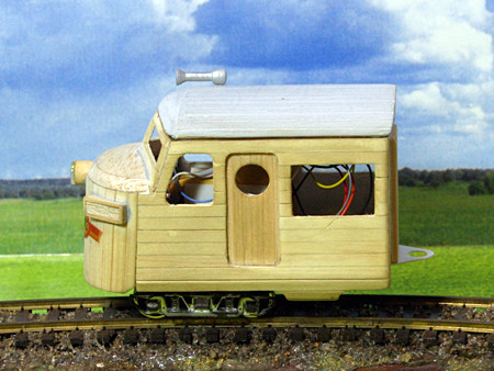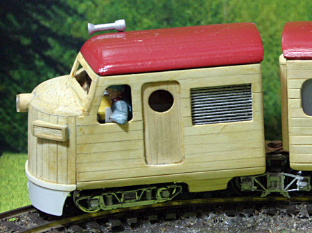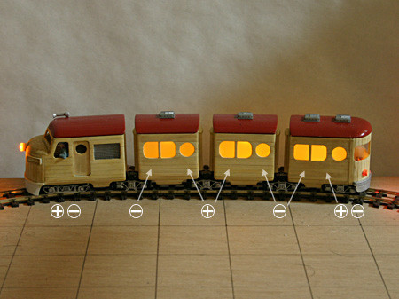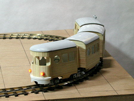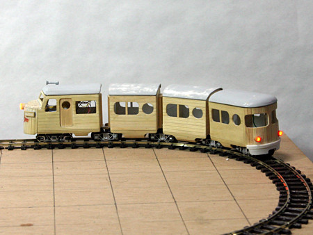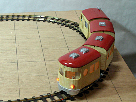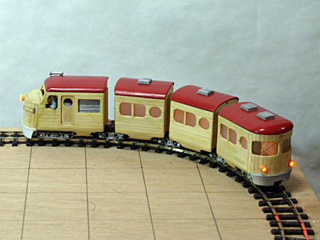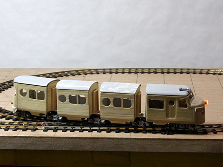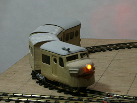 ナローゲージさんで購入した運転士を乗せました。 窓はセミクリアーのエンビ板で車内の配線なども見えにくく、室内灯が淡く輝いてくれます。最後尾の展望車部分はクリアーの窓で、車内にフィギュアを乗せる予定です。 室内灯は台車からの集電を(+)(ー)に分けて取り込んでいます。左下の写真は走行停止の状態です。前照灯はデコーダーでON、OFFできますが、室内灯、後尾灯はデコーダー経由ではないので点灯したままです。後尾灯がやけに眩しく明るすぎるので露光を調節します。