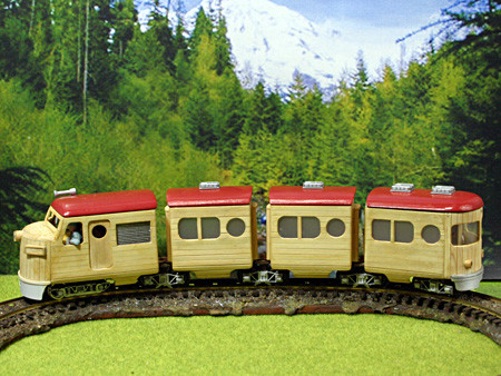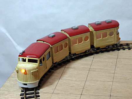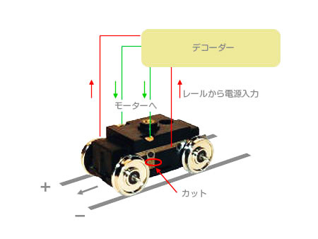 ヘッドライト(黄)、バックライト(赤)はLEDです。ヘッドライトは白の高輝度LEDでは明るすぎてナローらしくないので黄色にしました。ヘッドライトはデコーダー経由ですが、バックライトは直接レールから電源を取っています。そのためデコーダーでコントロールできず、消灯はできません。 客車は軽いのですが駆動車のパワートラックの重さだけでは、駆動車の車輪が空回りします。そこでパワートラックの周りに自作ウエイトを積んであります。15×15mmの正方形ナットの穴に、粒状のミクロウエイトをプラモ用パテで練り、埋め込みました。それをウエイトユニットにして、重さを調節してあります。駆動車にはそのウエイトユニットを7個積みました。(結構重い) 客車は車重が軽すぎてスピードを出すと脱線するので、台車に荷重がかかるよう連結部分の近くに1個積んであります。 左下はMRCの「BLACKBOX」です。DCCシステムがなくてもパワーパックにつないでDCCが楽しめます。 右下はDCCサウンドデコーダーで走行デコーダーもついています。SOUNDTRAXXの「DSD-090LC 821240」という機種です。(パワーパックはボルテージ全開・前進モードにします) ただし、DCC走行にするためには、パワートラック(天賞堂)の配線を変える必要があります。 電源入力の変更 「車輪→モーター」になっているのを「車輪→デコーダー→モーター」に変更しました。パワートラックの中に変更できる配線があると考え、パワートラックを分解してみましたが、構造は実にシンプルで複雑な配線は何もありませんでした。 車輪についている電源シューの一部をカットし電源の流れを「車輪電源シュー→デコーダー→ライト用コード接続部」にしました。ライト用コード接続部はモーターにも接続されているため、モーターは正常に動作します。ライトはデコーダーのライト用コードに接続します。 忘れ物: ここまで完成して何か足りないと思ったら、スピーカーがない!!ディーゼルの走行音を聞くのは来年でしょうね。 駆動車は台車1台でも走行します。台車はイモンの日車D16(日本車輛でしょうか)。台車の軸受けがパワートラックのホイールベースと0.3mmほど違うので、車軸を削り台車はパワートラックにくっつけてあるだけです。
