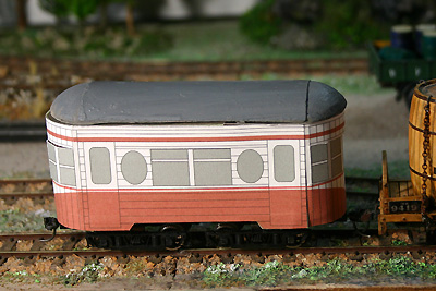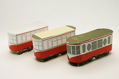 ケント紙で作ったモックアップです。台車もケント紙です。 楕円の戸袋窓がモ510形の特徴なので、左右の窓を3から2に減らし楕円の戸袋窓を大きくしました。